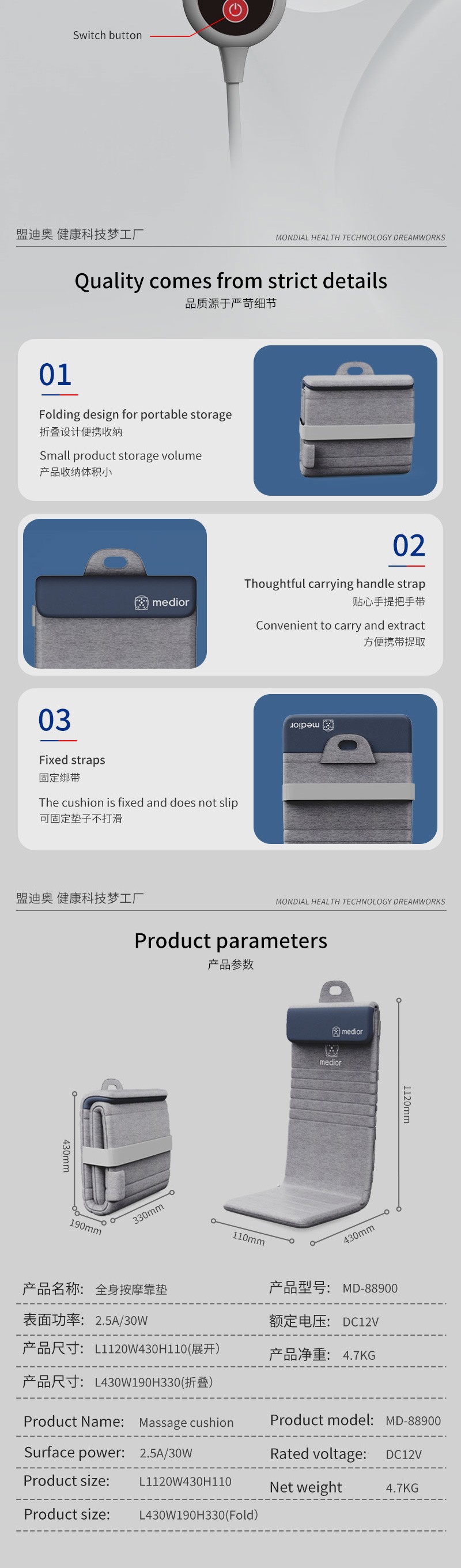1、L型機芯結(jié)構(gòu),對折包裝縮小體積2、獨家專利柔性機芯3、力度三檔調(diào)節(jié),定點按摩,腰背按摩、臀腿按摩、全背按摩模式選擇4、背部行走揉捏,按摩區(qū)域加長到從肩膀到大腿;5、更加貼合不同款式的椅子整體可對折收納